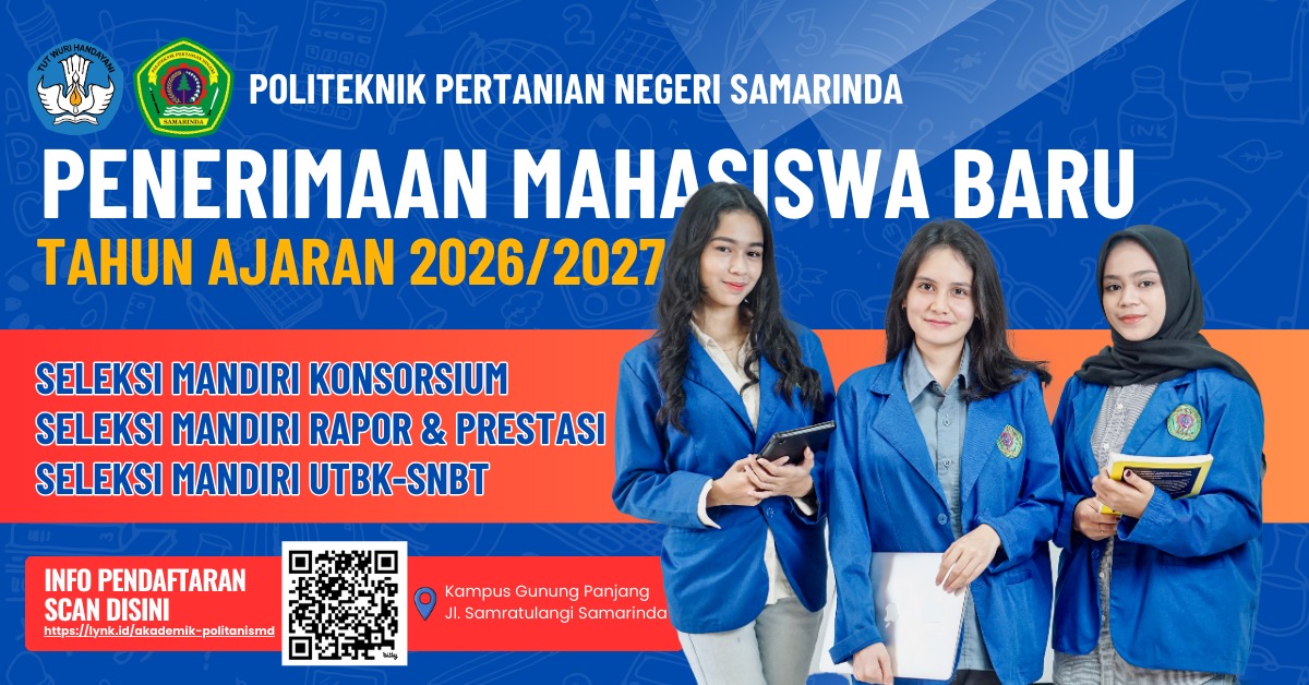 Selamat datang di Politeknik Pertanian Negeri Samarinda. Kami hadir untuk melahirkan generasi inovatif, tangguh, dan berintegritas. Dengan kurikulum vokasi yang adaptif terhadap kebutuhan industri, POLITANI siap menjadi mitra strategis pembangunan pertanian Indonesia. Bersama, kita tumbuhkan ilmu, inovasi, dan keberlanjutan untuk masa depan bangsa.