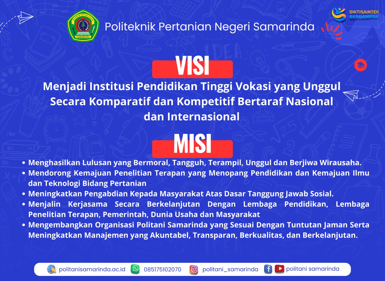Selamat datang di Politeknik Pertanian Negeri Samarinda. Kami hadir untuk melahirkan generasi inovatif, tangguh, dan berintegritas. Dengan kurikulum vokasi yang adaptif terhadap kebutuhan industri, POLITANI siap menjadi mitra strategis pembangunan pertanian Indonesia. Bersama, kita tumbuhkan ilmu, inovasi, dan keberlanjutan untuk masa depan bangsa.